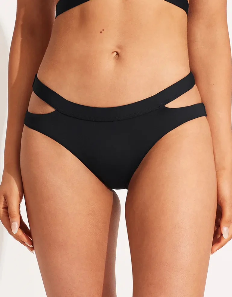 The black Split Band Hipster bikini pant from Seafolly Collective is the ever-popular but updated style from Seafollys old Active range. With moderate cut and split side band, it’s a perfect match for the Collective Halter Bra which has a matching split at the side and double straps at the back.