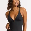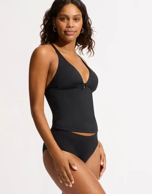 The Collective Trim Front Tankini top from Seafolly is a great style for a little more coverage. With a V neckline, finished with a square ring trim at the centre, removable cups and adjustable straps which can be worn straight or crossed at the back.
