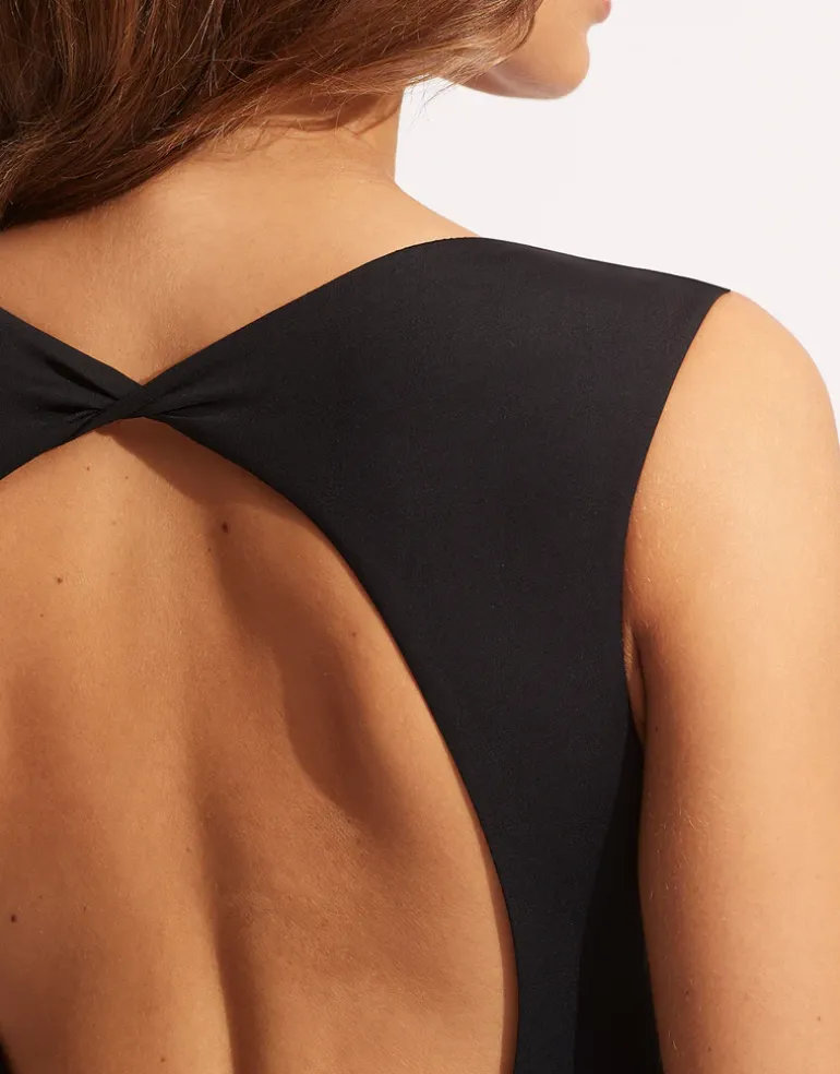 The elegant yet sporty Collective V Neck swimsuit from Seafolly has a deep plunging front and an open back with interesting twist detail at the neck. With wide straps, a shelf bra and removable cups for a great fit and support, this is a comfortable and yet effortlessly stylish looking suit.