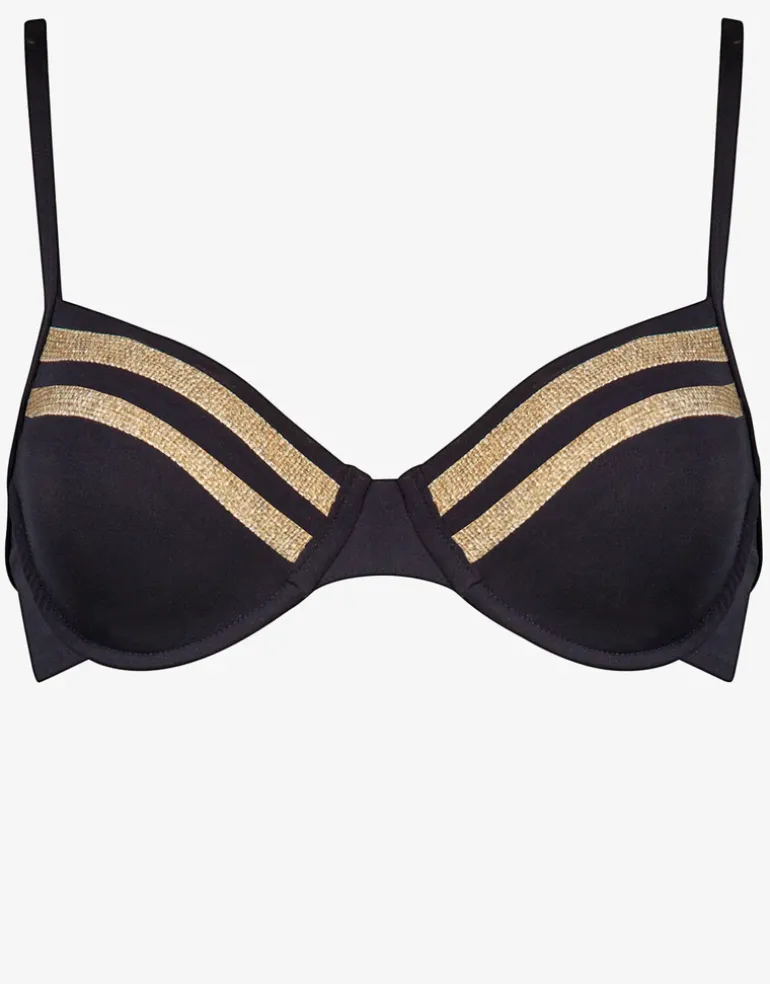 The Construction Underwired bikini top from Maryan Mehlhorn is a fabulous black and gold style with architectural panel detailing. The cups are underwired and the narrow straps are adjustable and convertible.