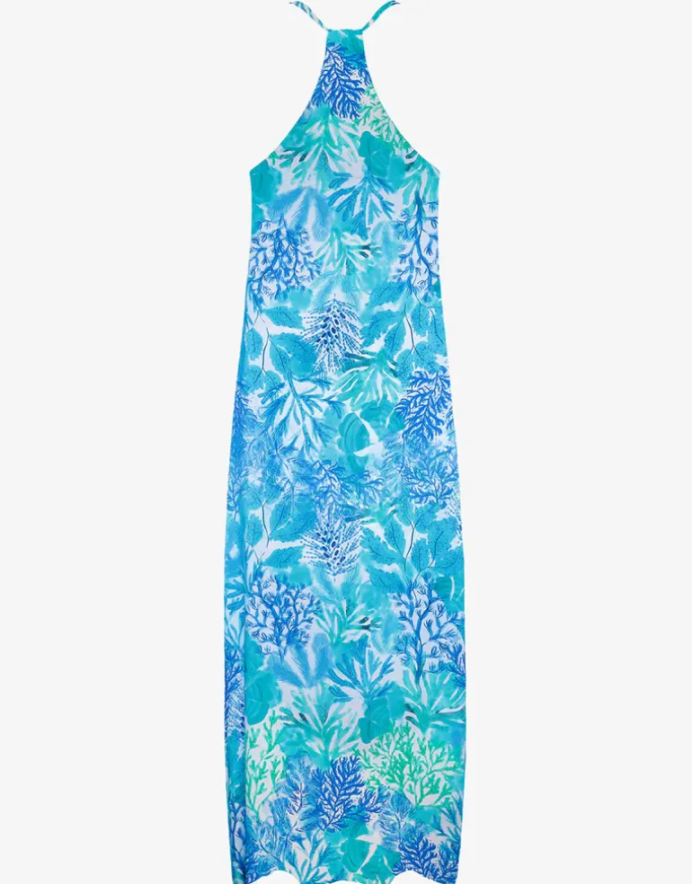 The Coral Maxi Dress from Tessy by Roidal is a beautiful blue and turquoise coral print, ankle-length dress with a V-neck and narrow straps that feed through a halter back and tie at one shoulder.