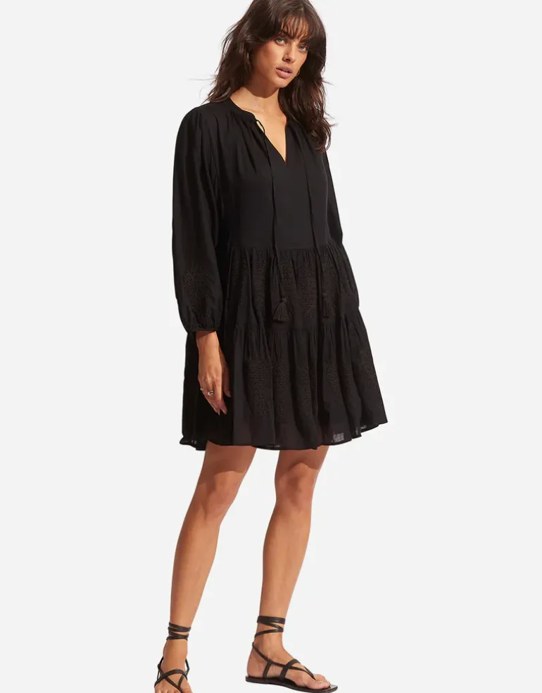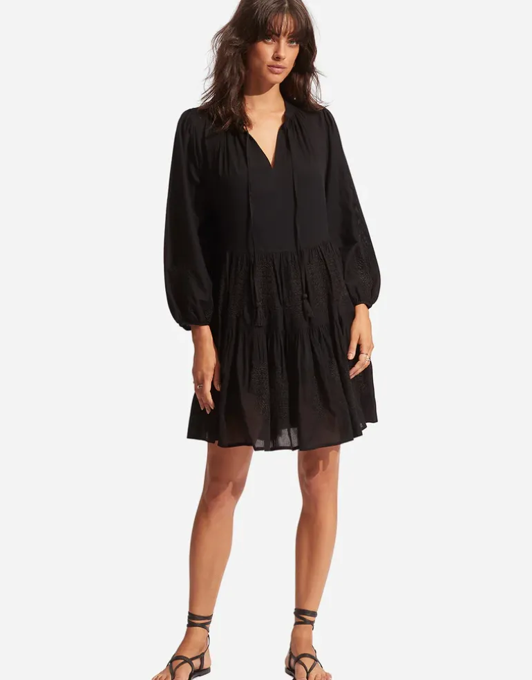 The Corsica Embroidery Tier Dress from Seafolly is a pretty black style with pineapples embroidered on the skirt and sleeves. With long sleeves, gathered at the cuffs, a V neck with tie and a tiered skirt which finishes above the knee.