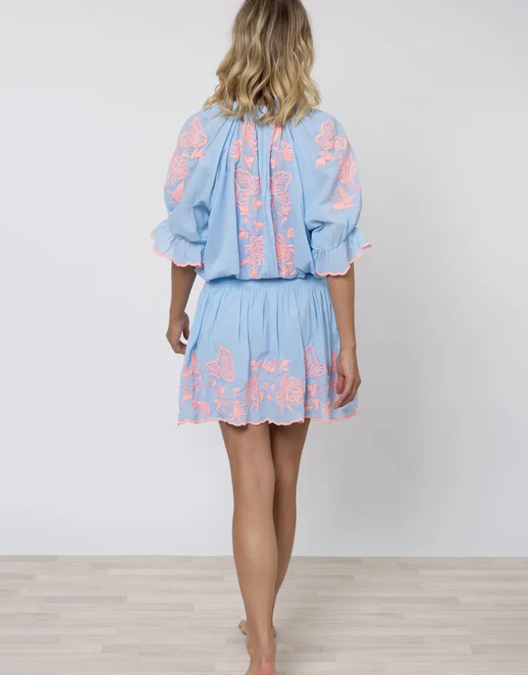 The Cotton Blouson Dress with Butterfly Embroidery from Juliet Dunn in beautiful pastel blue with neon pink floral embroidery is a mini length dress with a buttoned front, elbow-length scalloped sleeves and the neck is finished with a fluted collar. This dress can be worn loose and low at the hips or higher at the waist and cinched with the adjustable waist ties.