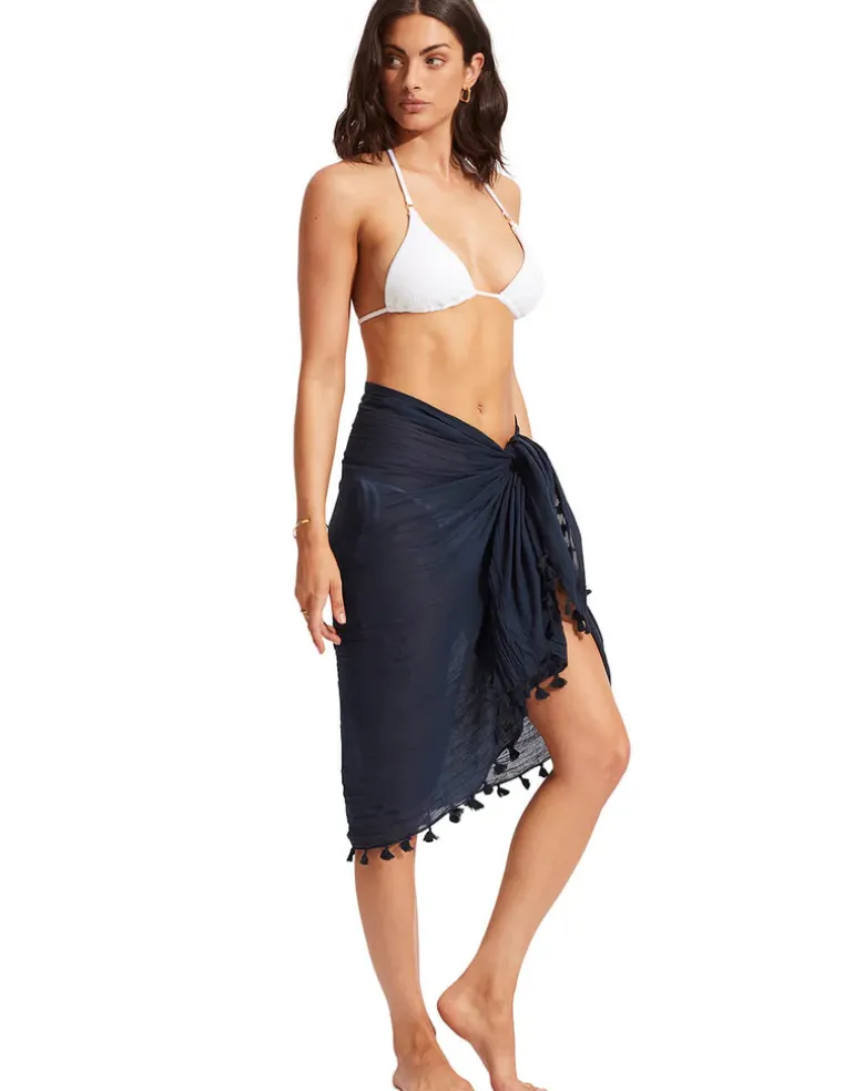 The Cotton Gauze sarong from Seafolly is a lovely dark blue cotton sarong with tasselled edging.