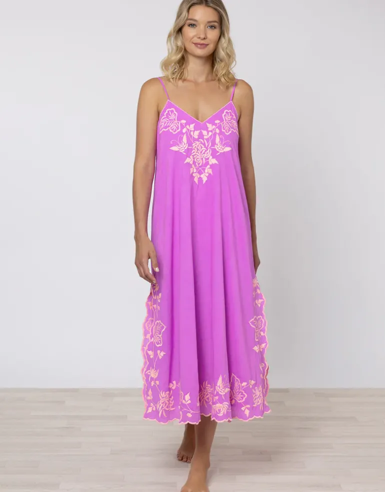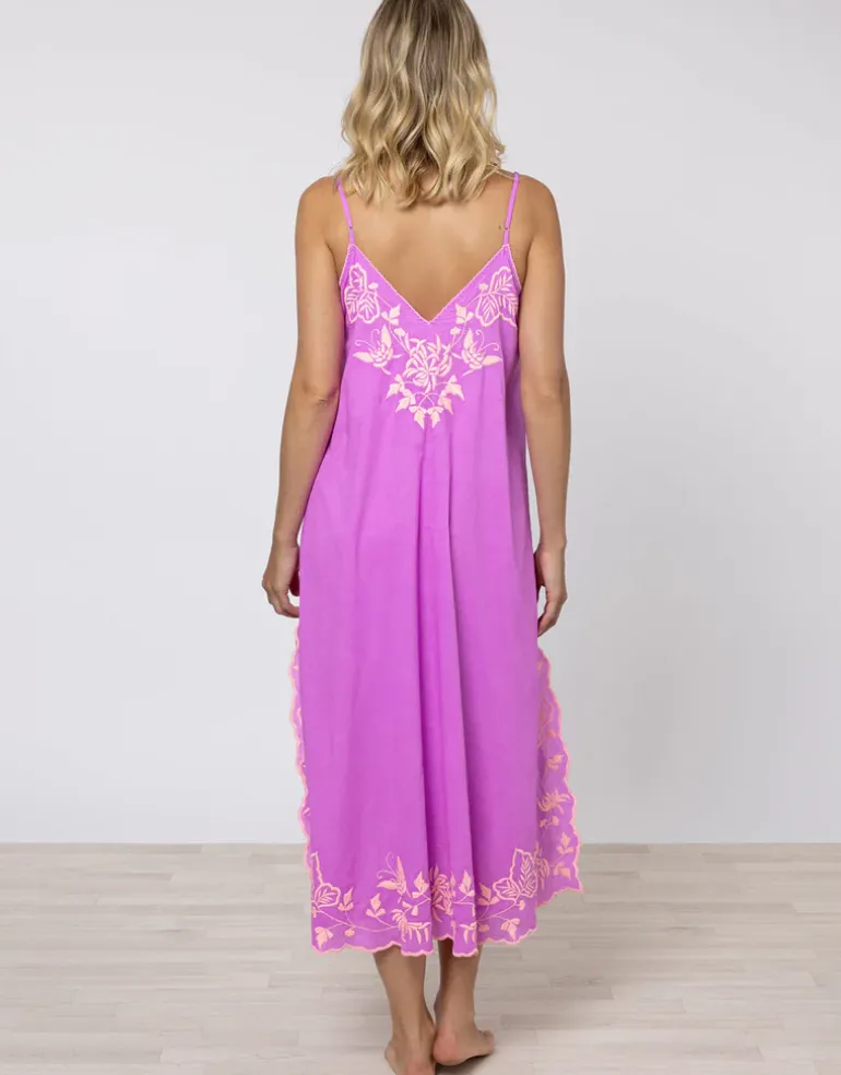 The Cotton V-Neck Slip Dress with Butterfly Embroidery from Juliet Dunn in this vibrant violet with pretty neon peach floral embroidery is a midi length, slip style dress with delicate scalloping around the neck and hemline, thin adjustable straps, and side splits.