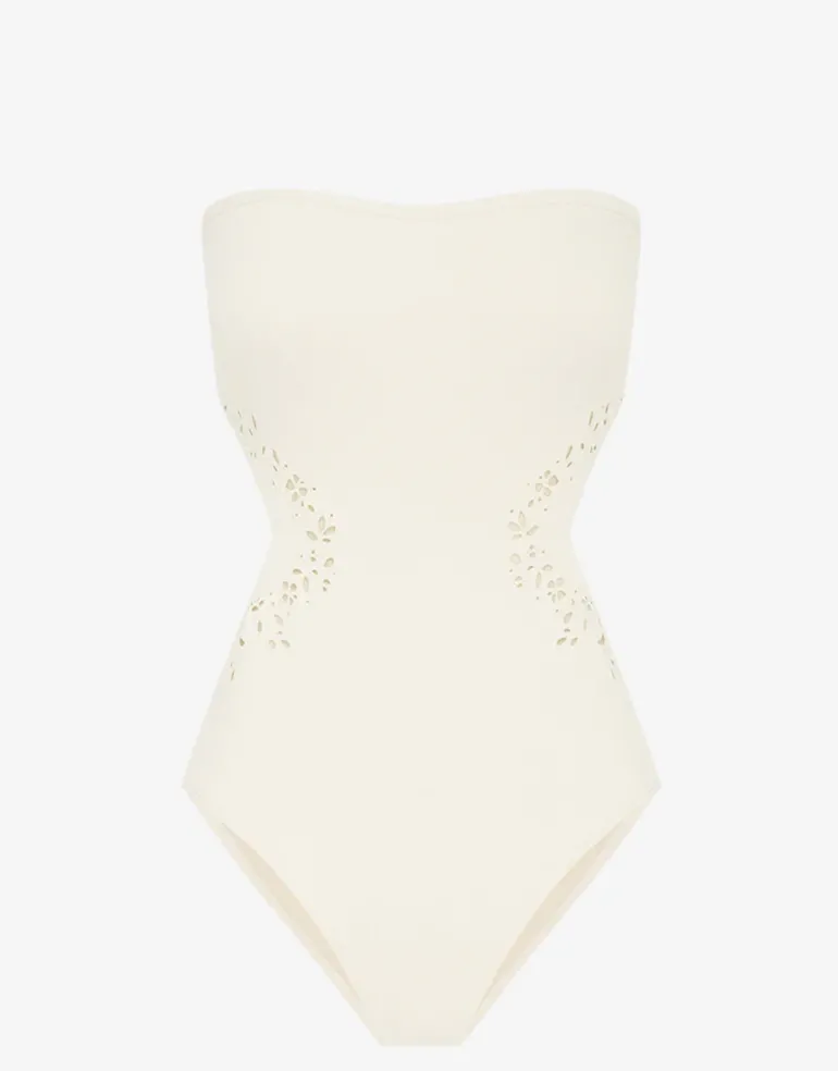 The Creme Memoir Embroidered Strapless swimsuit from Peony is a beautiful statement piece with cut out sides and open back with delicate floral embroidery on the front to create an hourglass effect. This bandeau style has gripper tape and a multi fit back closure for great support and fit.