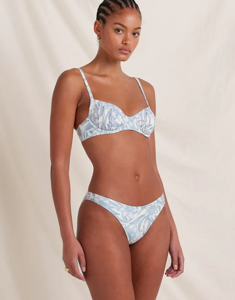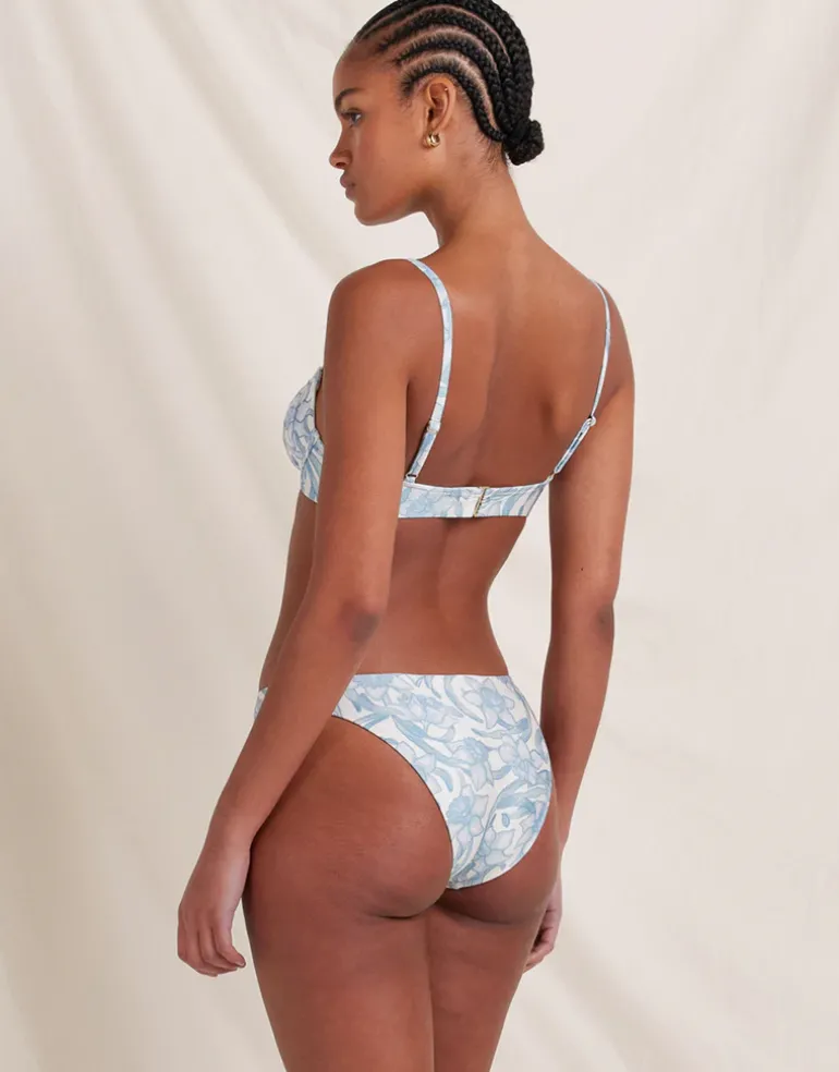 The Daffodil Poolside Balconette bikini top from Peony is a beautiful white and blue floral print, balconette style with underwire, multi-fit back closure, removable padding and adjustable straps.