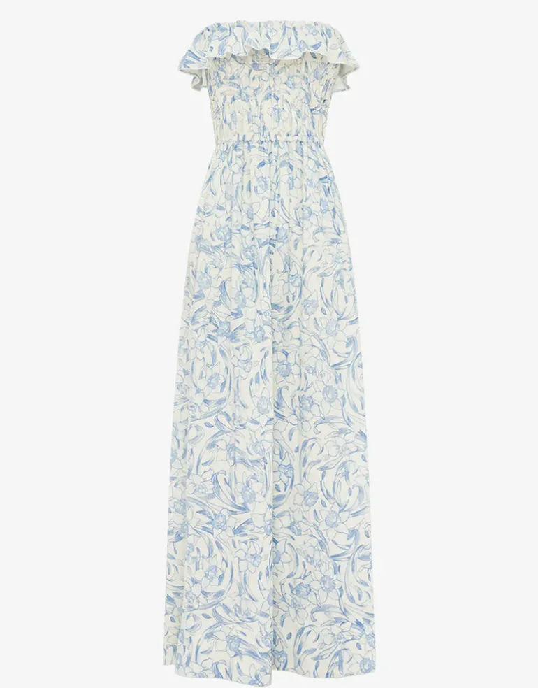 The Daffodil Shirred Midi Dress from Peony is a midi length style with a gathered smocked bandeau bodice with a flounce ruffle edging and a full gathered skirt.