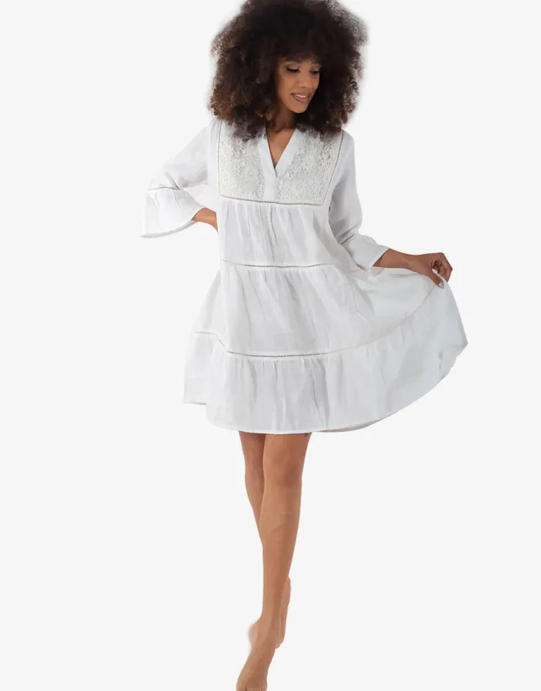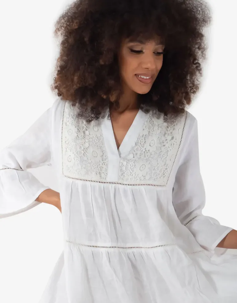 For a sophisticated vacation style choose the Iconique white Dalia dress from Iconique. Woven from a luxurious linen and cotton blend, this breezy dress features a flowy design with a multi-tiered skirt and a lace insert at the top.