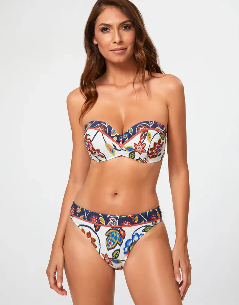 The Dana Bandeau bikini top from Nuria Ferrer is a pretty white and navy tapestry style print. This shaped bandeau style has underwire and moulded cups, a clip at the back and optional adjustable straps.