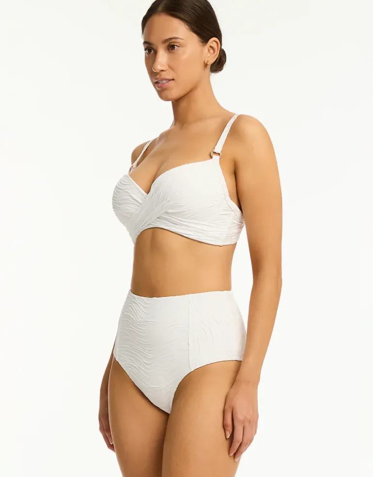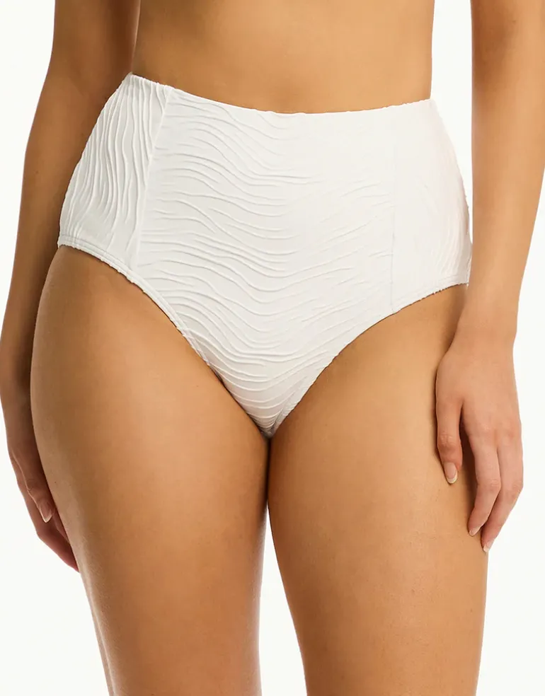 The De Soleil Panelled High Waist bikini pant from Sea Level is a retro-classic high cut style with precise construction made from soft wavelet design textured fabric. In a high waist style with a panelled front.