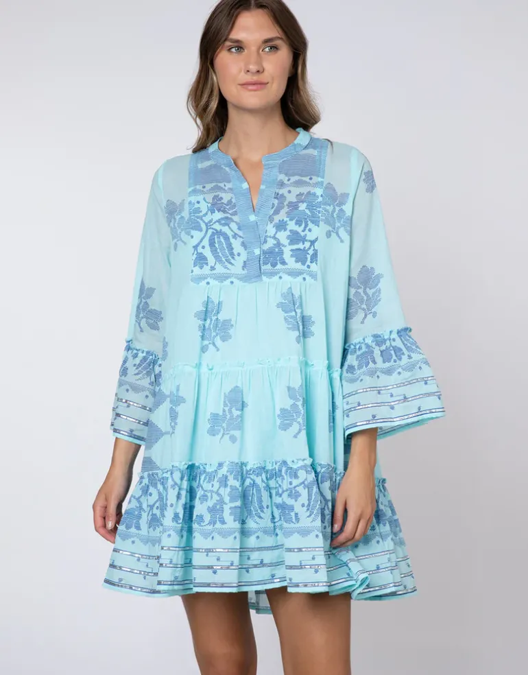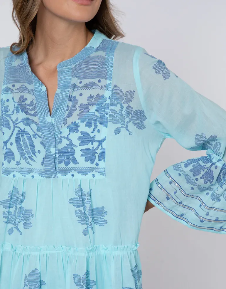 The Dhaka Print Flared Sleeve dress from Juliet Dunn in pale blue organic cotton is hand printed with royal blue floral detailing and has metallic trim highlights at the hem. With a slashed V neck, flared sleeves, a tiered skirt and a dipped hem.
