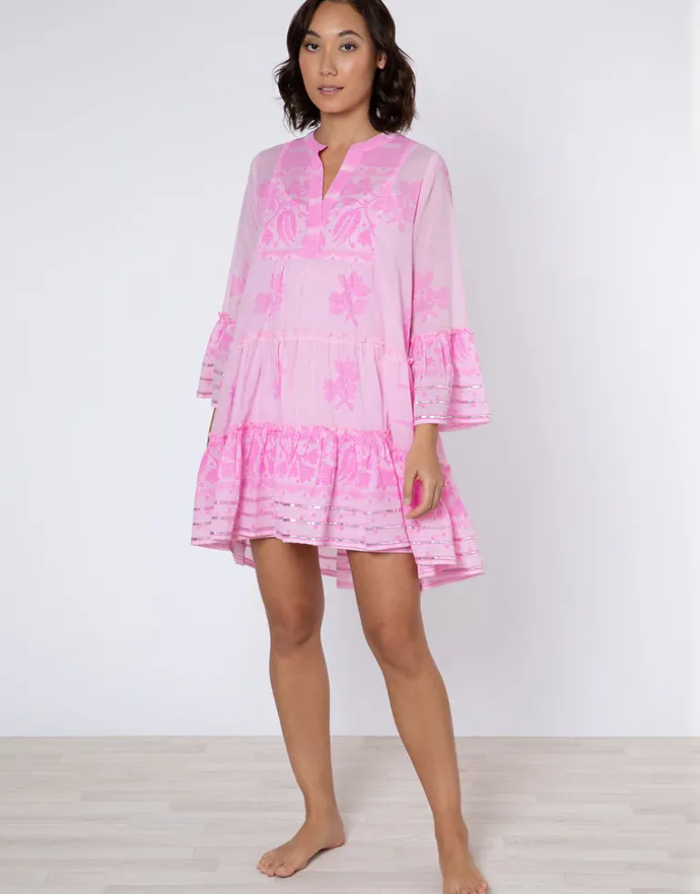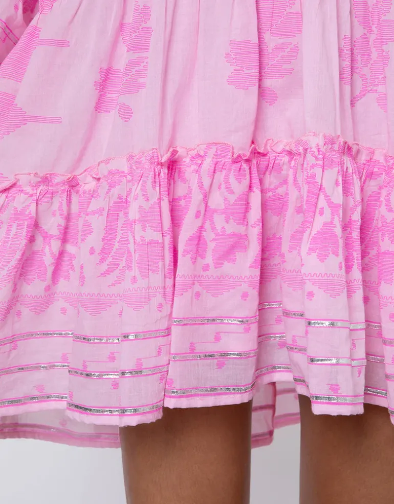 The Dhaka Print Flared Sleeve dress from Juliet Dunn in pretty pink organic cotton is hand printed with bright pink floral detailing and has metallic trim highlights at the hem. With a slashed V neck, flared sleeves, a tiered skirt and a dipped hem.
