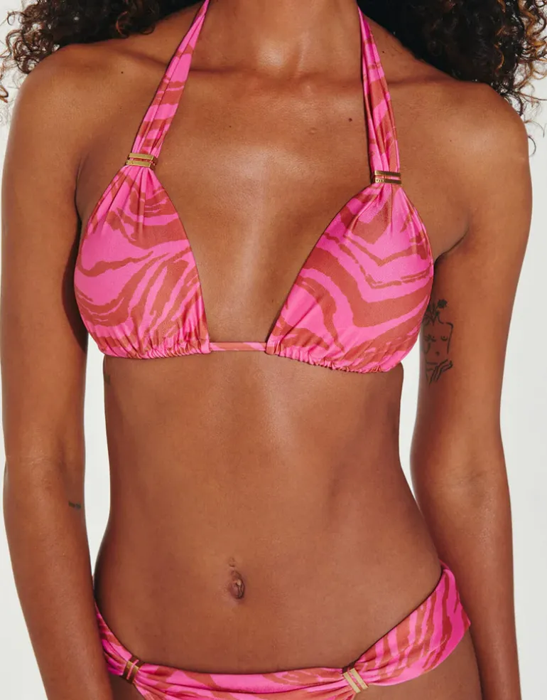 The Diani Bia Tube bikini pant from ViX is a lovely pink and red animal print bikini pant in classic full cut Bia shape signature gold-coated ViX branded sliders.