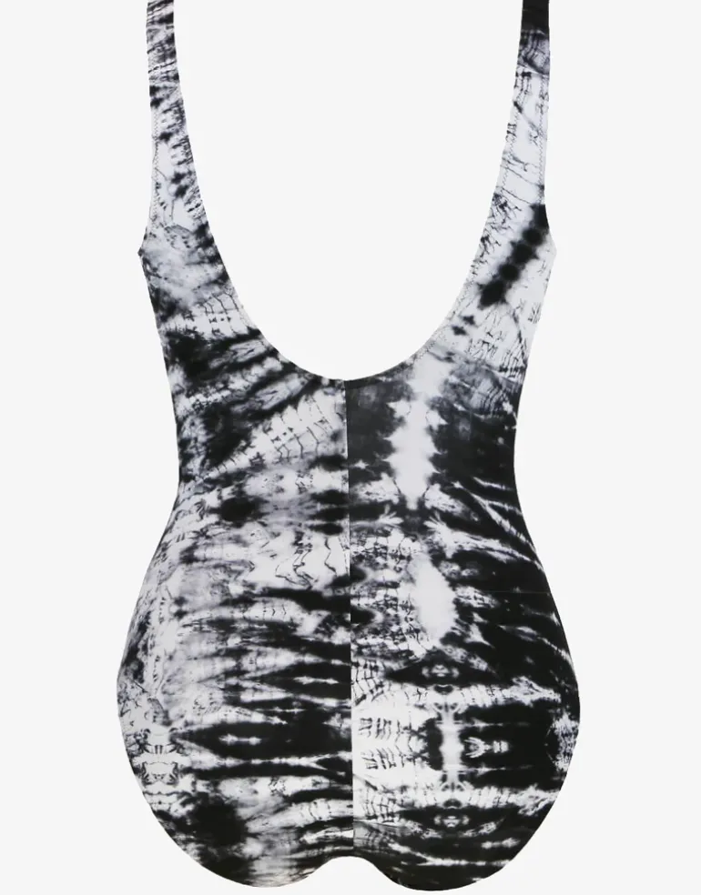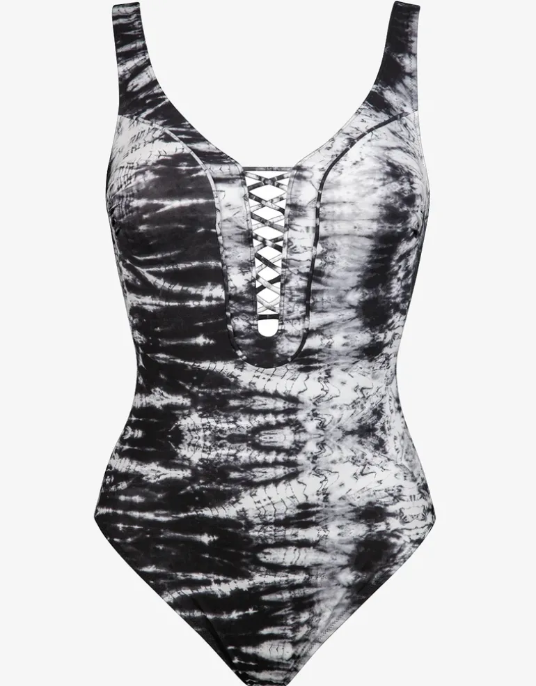 The Discovery Underwired swimsuit from Maryan Mehlhorn is a great tie dye effect black and white style with laced detail at the front, bust shelf with underwired cups, and scoop back.