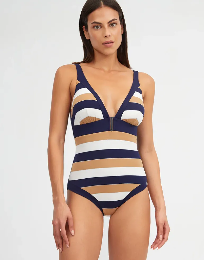 The Doris Plunge swimsuit from Nuria Ferrer is a lovely Navy, caramel and white striped style with a plunge neckline and wide band under the bust complete with metallic bar detail. With moulded cups, adjustable straps and tummy control for a flattering and supportive silhouette.