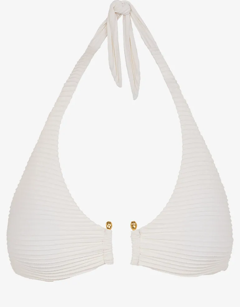The Dune Jill Alanna bikini top from ViX in this beautiful white, ribbed fabric is a classic halter style accented with a gold-plated U bar detail at the centre. There are neck and back ties for an adjustable fit and removable padding for shape and support.