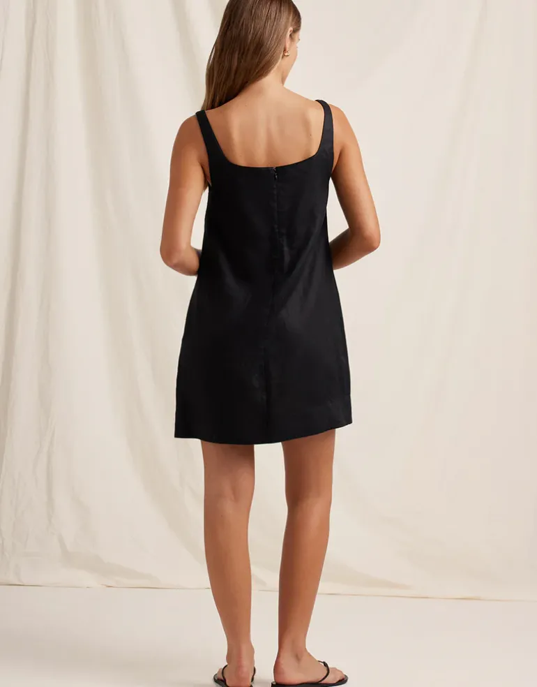 The Ebony Embroidered Shift Mini dress from Peony is a chic, linen shift dress with large pockets either side that are embellished with a floral embroidery. The A line silhouette is flattering with a soft, square neckline and this style is lined with an invisible zip on the back.