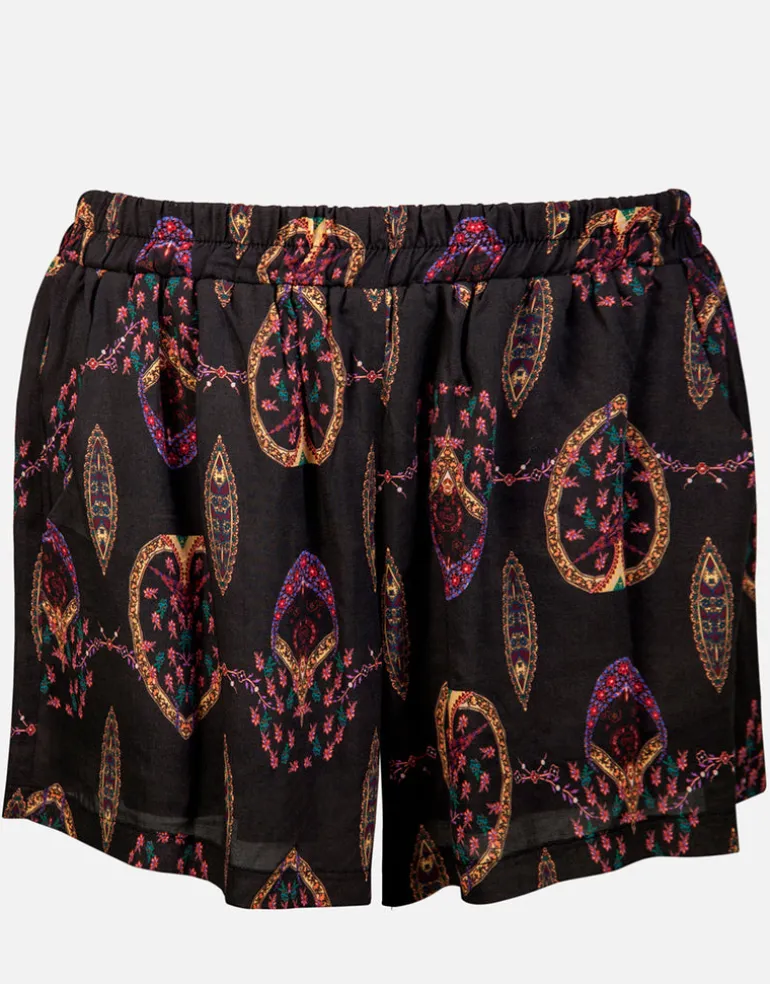 The Eclectic Flames beach shorts from Watercult are a great loose-fitting, elasticated waist style in black with pink and gold paisley-esque design and feature side pockets.