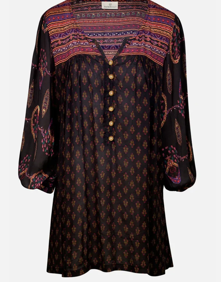 The Eclectic Flames Tunic from Watercult is a lovely loose-fitting, mini length kaftan-blouse style with balloon sleeves, gathered at the cuff and a V neck with buttons.