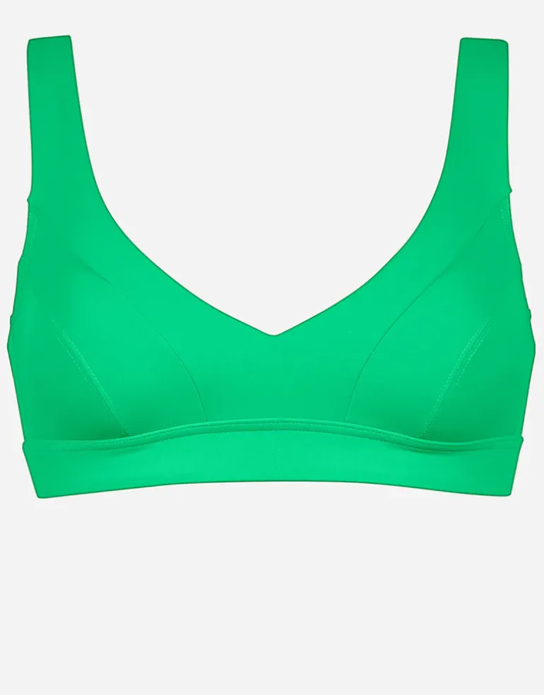 The Eco Shape Bralette bikini top from Lidea is a gorgeous green bikini top with panelled cups, a wide under bust band for support and full lining. The Eco Shape range is made from 100% recycled nylon made from consumer waste. The shell fabric and sewing thread is made from recycled material as are the care label and logo. The latex-free rubber used is recyclable and the packaging is completely biodegradable.