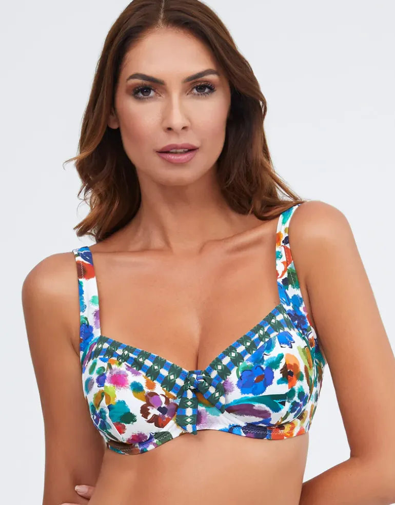 The Eda Underwired bikini top from Nuria Ferrer is a pretty and colourful floral print on white with a contrast print border. This supportive underwired style has adjustable straps, a clip back and a decorative bow detail at the centre front.