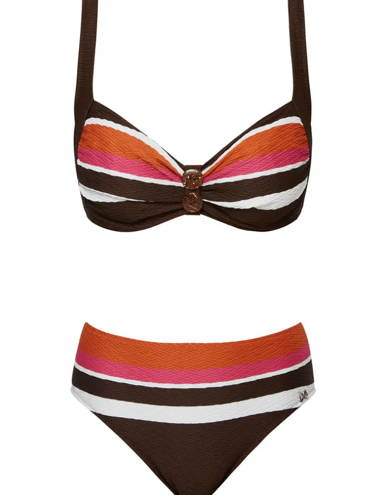 The Eden Underwired bikini from Nuria Ferrer is a bold stripe design in chocolate brown, pink, orange and white textured fabric. This bikini comes as a set and includes underwire and adjustable straps on the bikini top, with double button detail at the centre and the pant is has full-coverage and tummy control.