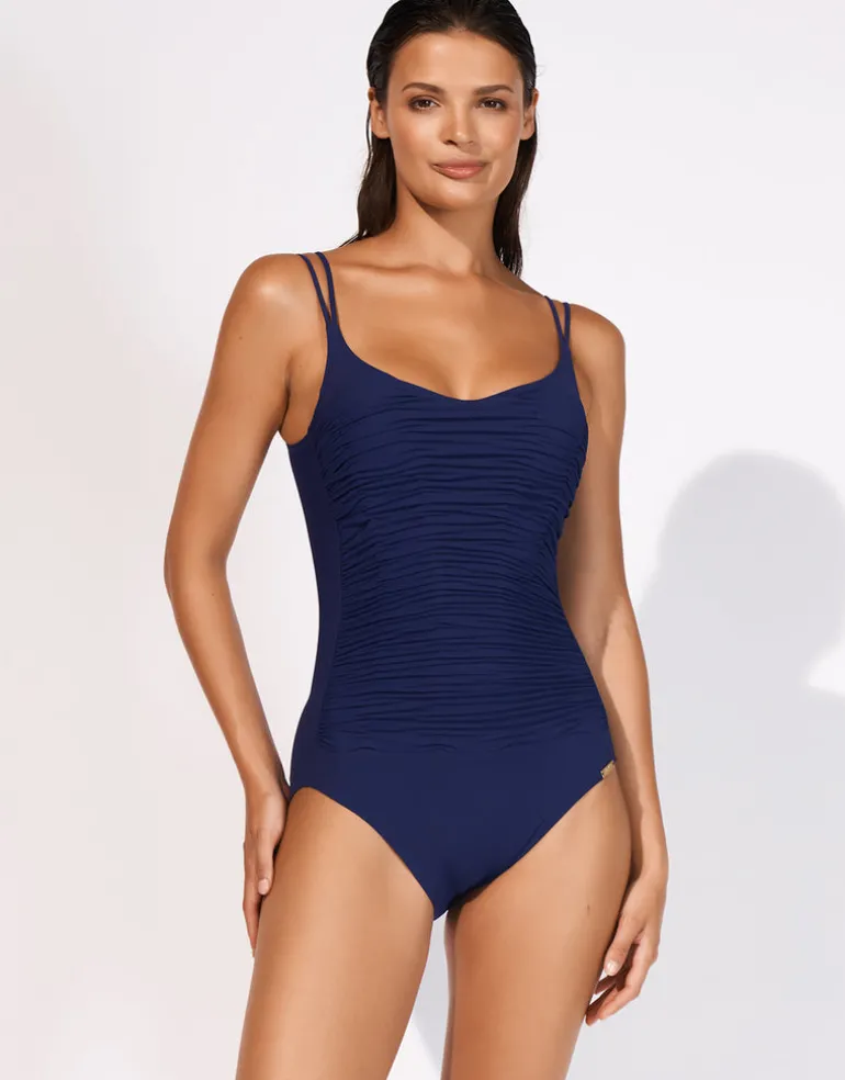 The Elements Underwired swimsuit from Maryan Mehlhorn in dark Indigo blue has flattering ruching across the front, underwired cups and double narrow adjustable straps.
