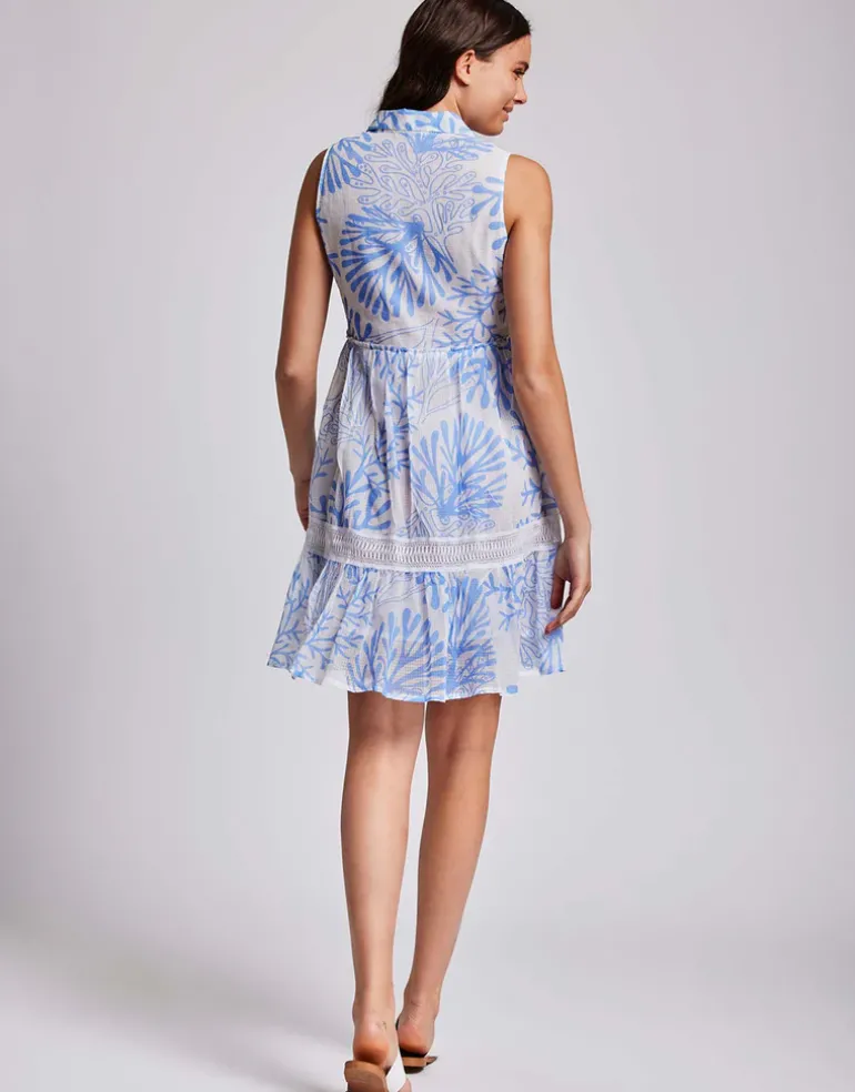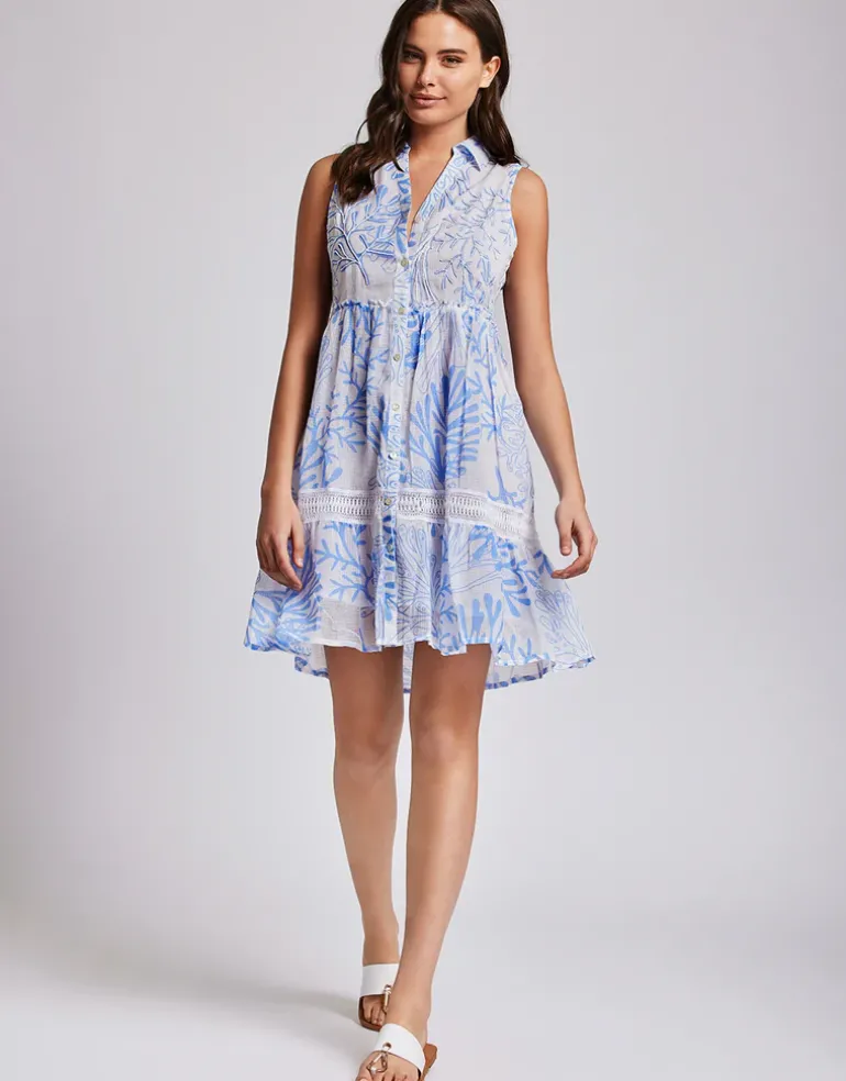 The Elsa Sleeveless Shirt dress from Iconique is a mini dress for a feminine and fun resort wear outfit. This lightweight sleeveless dress features a fully buttoned front and a wide asymmetrical layered skirt for an effortless summer look.