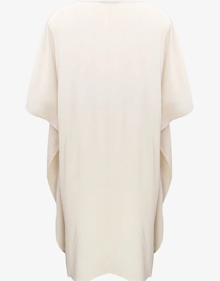 The lovely knee-length Embroidered Kaftan from Lidea has delicate Wisteria-like same coloured embroidery detailing at the V shaped neckline. A beautiful cover-up for any swimwear.