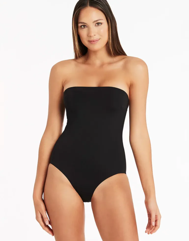 The Essentials High Leg Bandeau swimsuit from Sea Level Australia is made from eco-friendly fabric made from regenerated nylon fibres. This simple straight neck bandeau style has removable cups, adjustable and convertible straps and power mesh for a supportive fit.