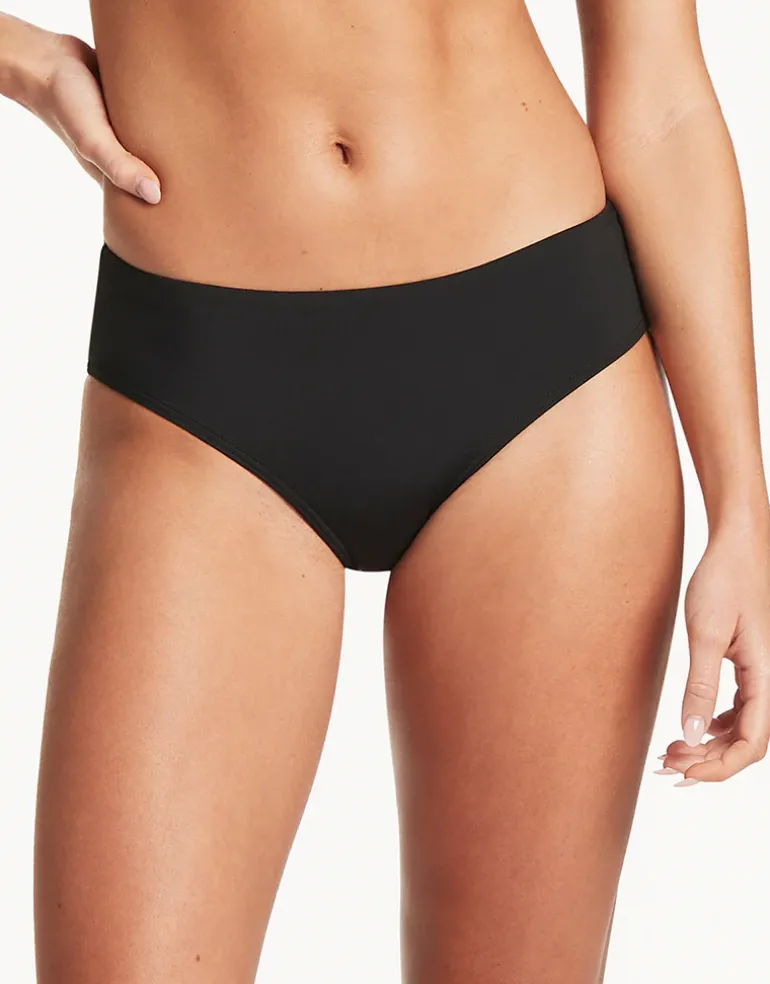 The Essentials Mid bikini pant from Sea Level Australia is a simple, plain black, classic fit pant with wide sides and moderate coverage.