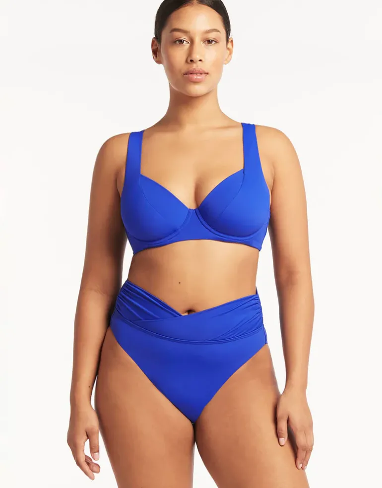 The Essentials Underwired C/D Cup bikini top from Sea Level Australia is made from eco-friendly fabric made from regenerated nylon fibres. This lovely underwired bikini top in Cobalt blue has adjustable and convertible straps, power mesh and an E-hook fitting for a great fit.
