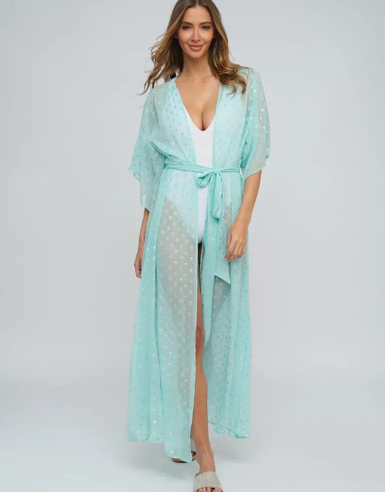 The Estepona Maxi Kaftan from Pia Rossini is a beautiful maxi-length open kaftan with elbow-length sleeves and a tie at the waist. The pretty sheer turquoise fabric is decorated all over with little silver spots.