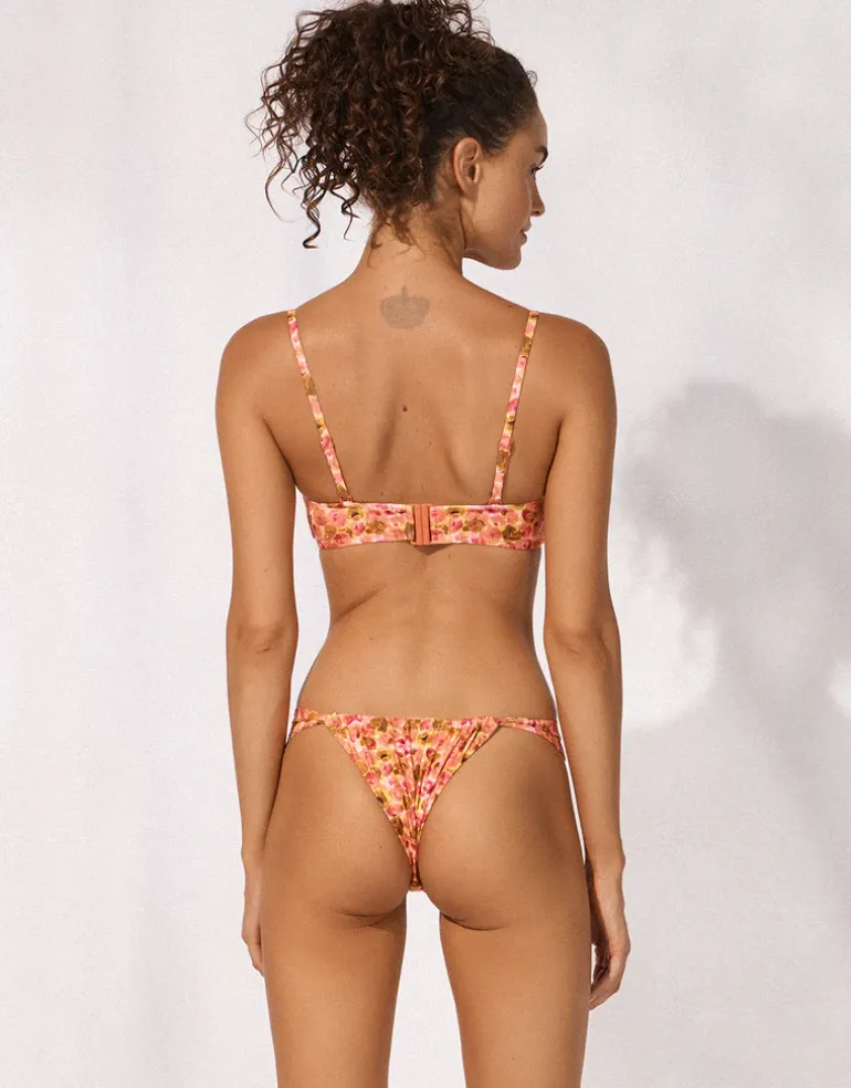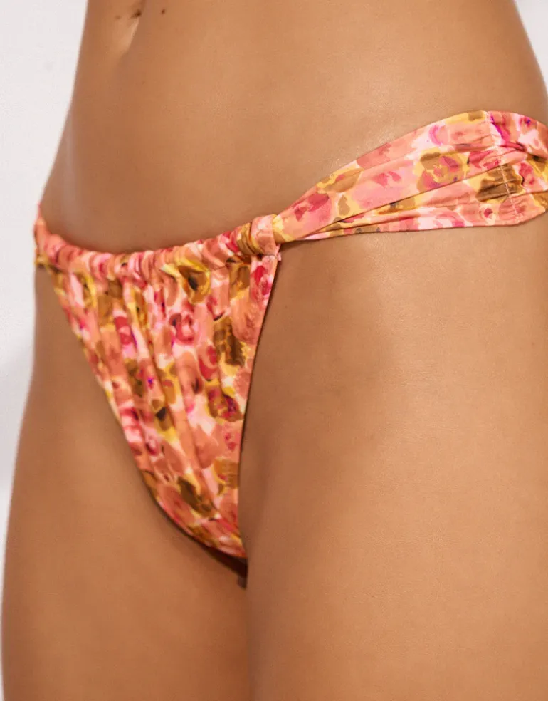 The Euphoric Bloomwave Brazilian Bikini Pant from Watercult in a retro, floral micro-print of pinks, oranges and yellows is a hipster style pant with a pleated front and a high leg offering minimal rear coverage.