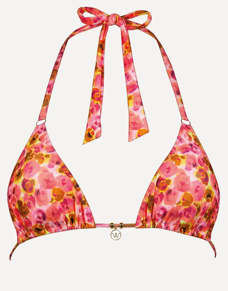 The Euphoric Bloomwave Triangle bikini top from Watercult is a lovely triangle halter style featuring a vibrant floral print of orange, pinks, and yellows. Enhanced with gold metallic rings at the cup apexes and a signature metallic logo detail between the cups. Tie neck and back closures and removable, moulded foam cups provide customisable shape and support.