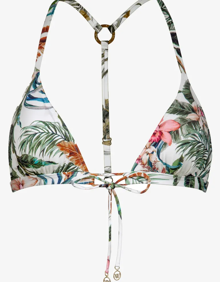 The Exotic Dive T-Back Triangle bikini top from Watercult in this lovely Retro Tropics floral print is an eye-catching style with an adjustable T strap at the back with a ring detail and a decorative tie at the front finished with branded charms.