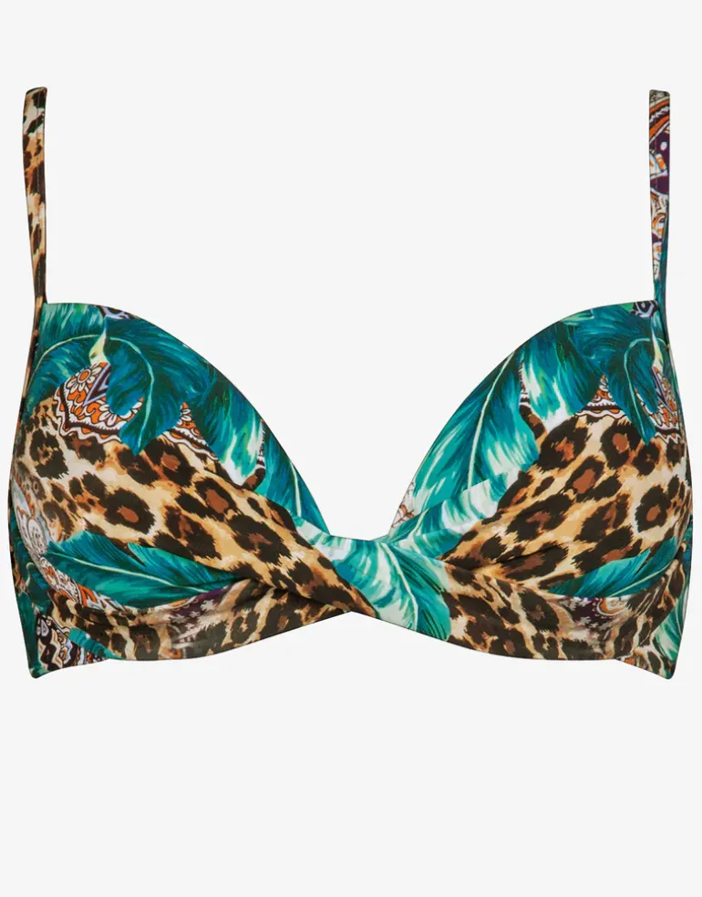 The Exotica Underwired bikini top from Maryan Mehlhorn is a striking emerald green leaf and leopard print. In a twist-front style with moulded cups and underwire, narrow adjustable straps and a clip back.
