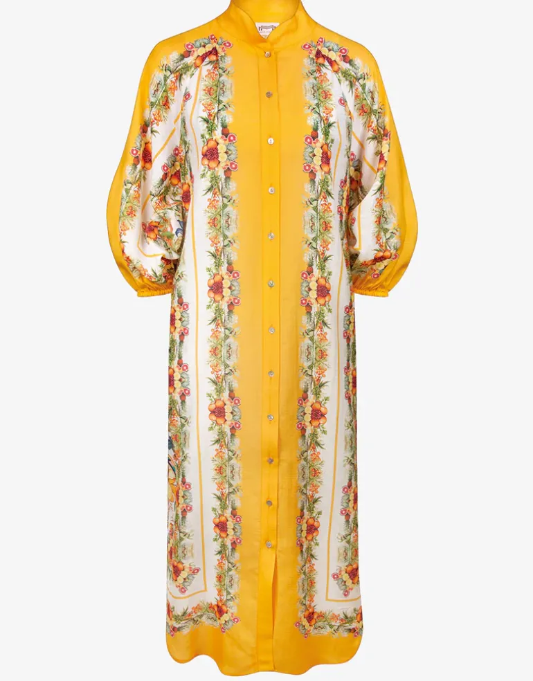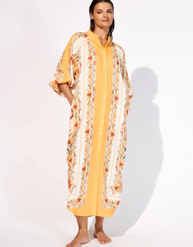 The Exuberance Buttoned Maxi shirt from Maryan Mehlhorn in a Sicilian inspired floral print of yellow, orange and green on a baked white background is a relaxed, maxi beach shirt with elbow length balloon sleeves and a mandarin style collar.