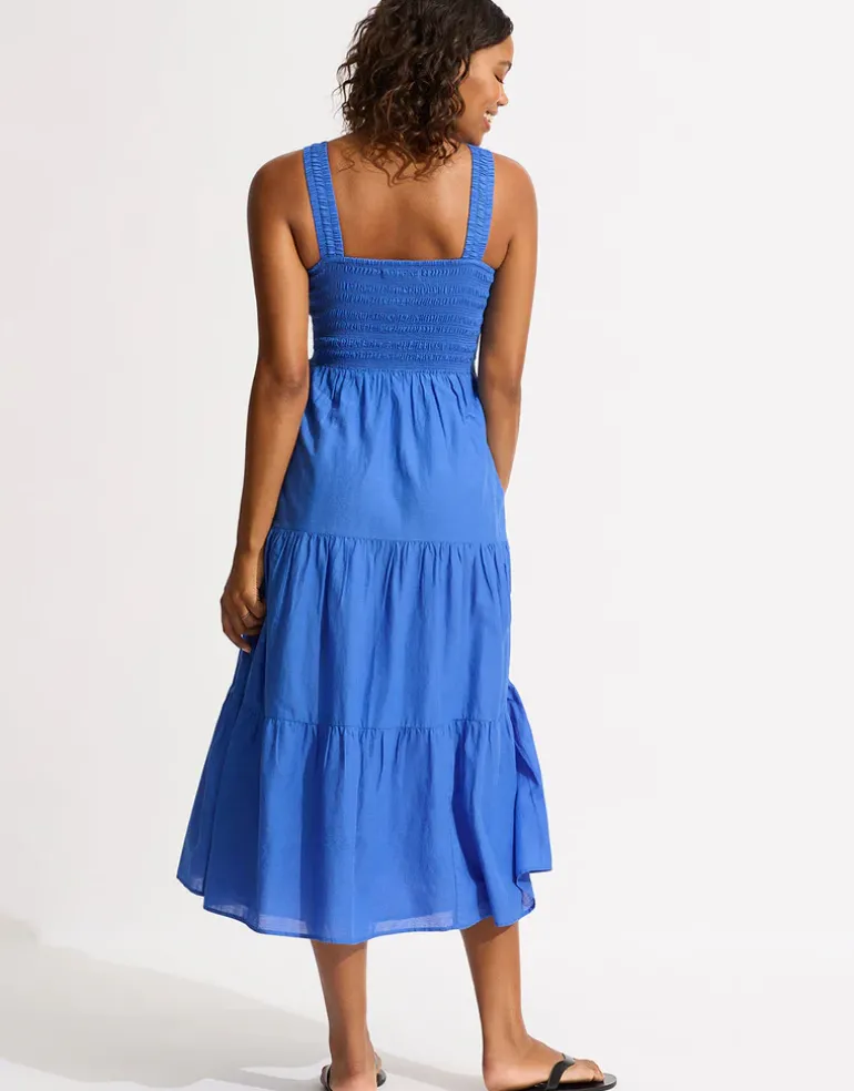 The Faithful Midi dress from Seafolly in gorgeous Azure blue is an easy summer dress with an elasticated smocked bodice and wide shoulder straps, a midi length tiered skirt and in-seam side pockets.