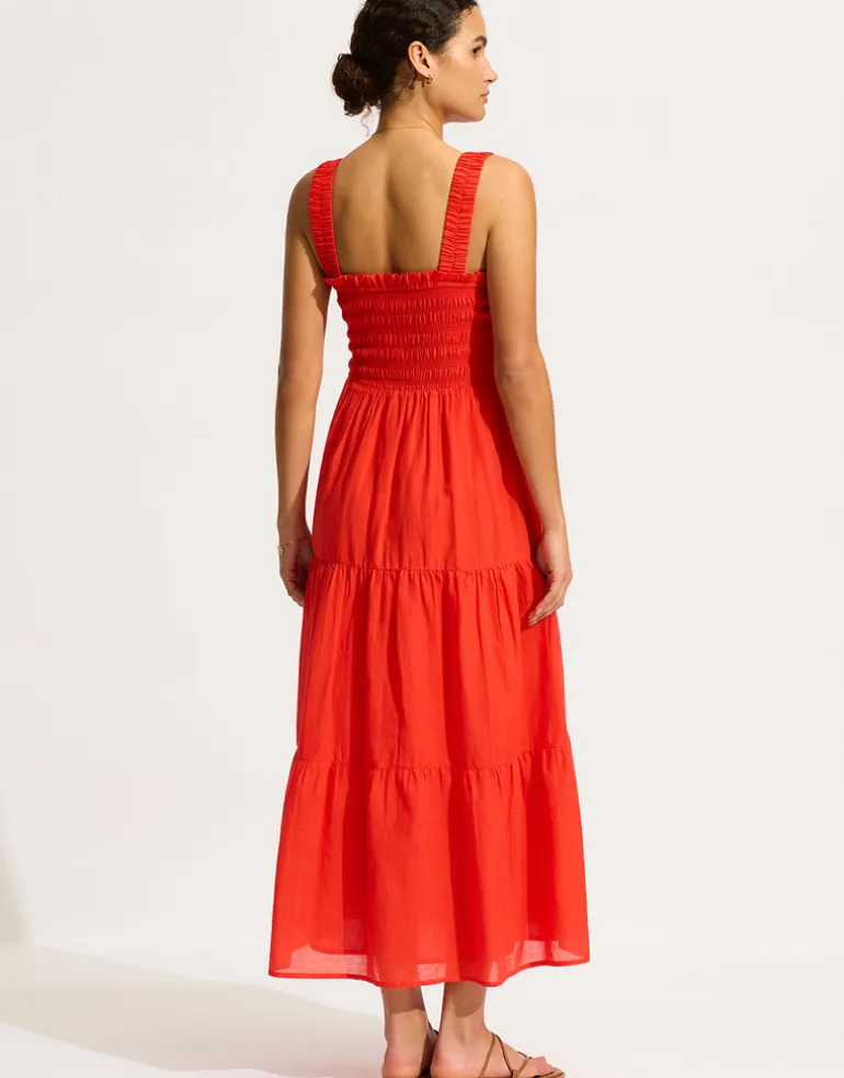 The Faithful Midi dress from Seafolly in vibrant Flame red is an easy summer dress with an elasticated smocked bodice and wide shoulder straps, a midi length tiered skirt and in-seam side pockets.