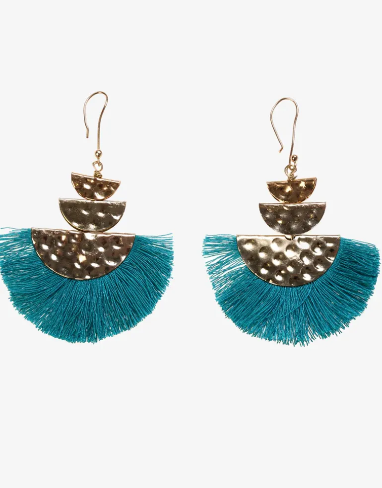 The lovely Fan earrings from Iconique are a dimpled metallic gold tier of three semi-circles with the largest at the bottom holding a fan of teal coloured threads. These attach to the ears by a simple hook. The product is labelled as cobalt, but the actual colour is teal.