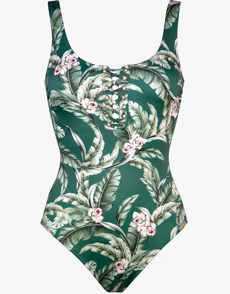 The beautiful Fantasy Resort swimsuit from Watercult is a lovely green leaf print with pale pink flowers. This classic style has criss-cross laced detailing at the centre front and removable cups for shaping.