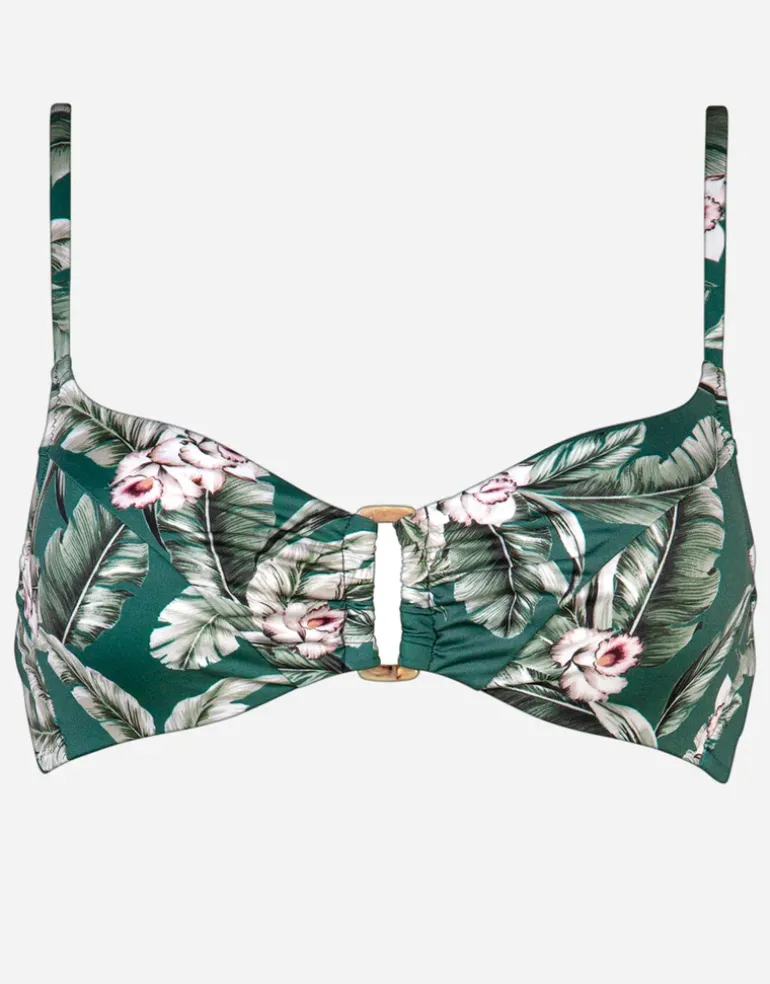The lovely Fantasy Resort underwired bikini top from Watercult is a lovely green leaf print with pale pink flowers. This underwired style has a ring detail at the centre front and narrow adjustable and convertible straps.