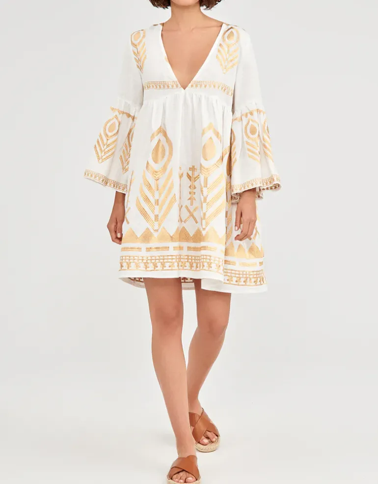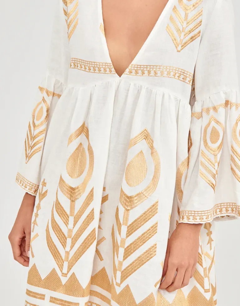 The Feathers Mini dress from Greek Archaic Kori in crisp white linen adorned with beautiful gold feather embroidery. With its flattering plunge V-neckline, relaxed waistline, and graceful lantern sleeves, this dress is a striking piece for your holiday wardrobe.