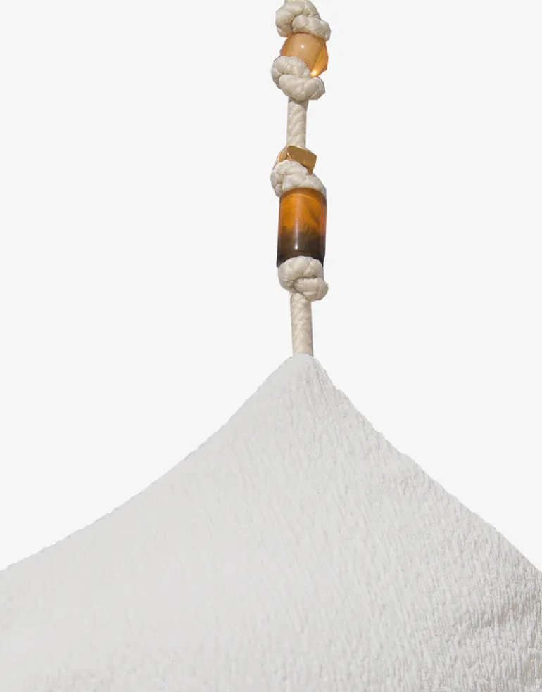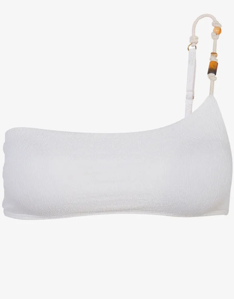 The Firenze Ana Flora bikini top in off white from ViX is a beautifully detailed yet understated style. In textured Firenze fabric, this asymmetrical style top pulls on and has a single adjustable strap to one shoulder, finished off with tortoiseshell resin and metal details, knotted within matching off white elastic rope.