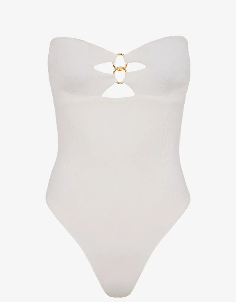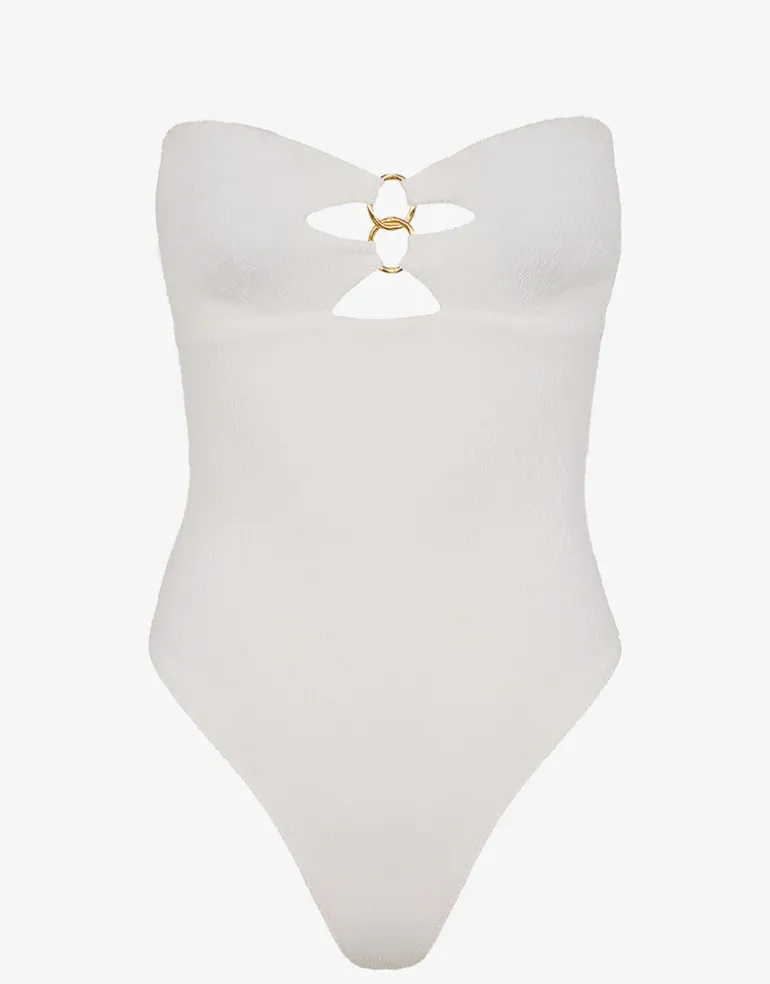 The Firenze Jolie Bandeau swimsuit from ViX is a stunning strapless one-piece crafted from textured Firenze fabric. Featuring a chic cut out design with elegant gold ring accents at the centre of the cups and a high leg line, this swimsuit offers optional removable straps for versatile styling.