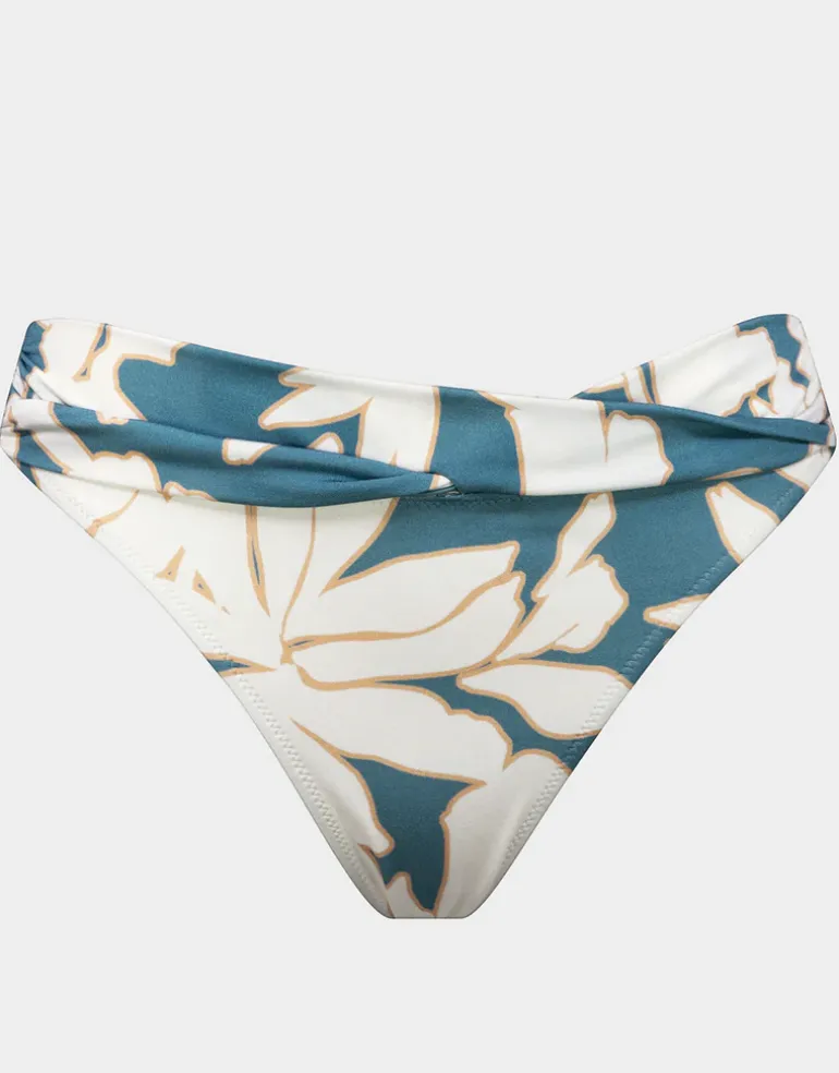 The Floral Abstract Twist Front bikini pant from Watercult in a delicate blue and cream floral print, features a stylish twist band detail at the waist. This design provides moderate coverage, balancing style with comfort.