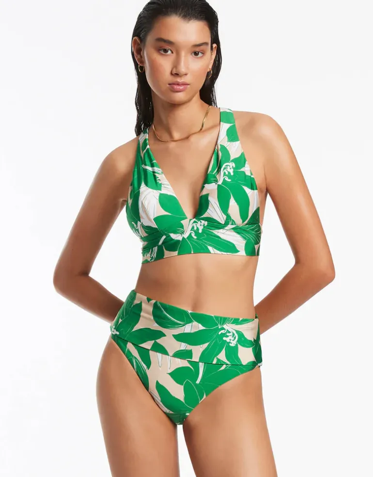 The Floreale Fold Down bikini pant from Jets is a gorgeous green and cream print bikini pant with maximum coverage at the back and waist with a deep folded waistband which can be adjusted for the perfect fit and coverage.