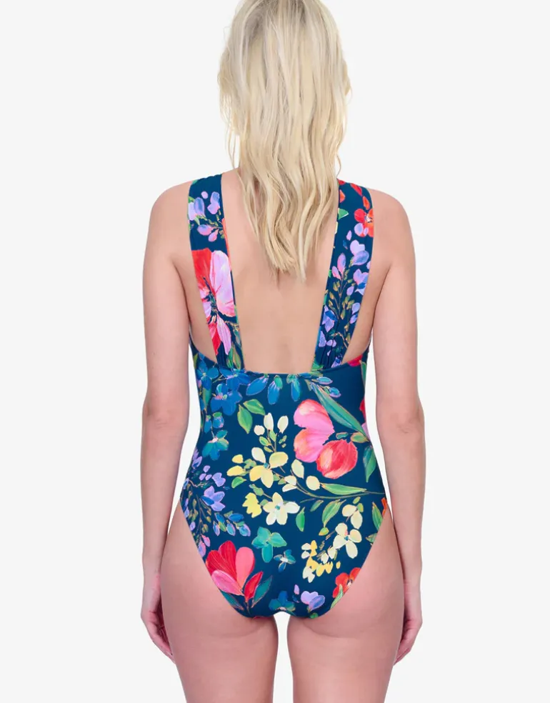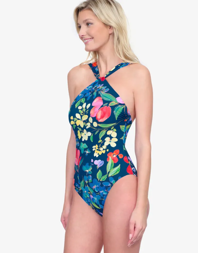 The Garden Dream High Neck swimsuit from Gottex in a lovely multicoloured floral print of pinks, yellows and greens on navy blue background is a high neck style with a twist featuring soft cups and tummy control for great shape and support.